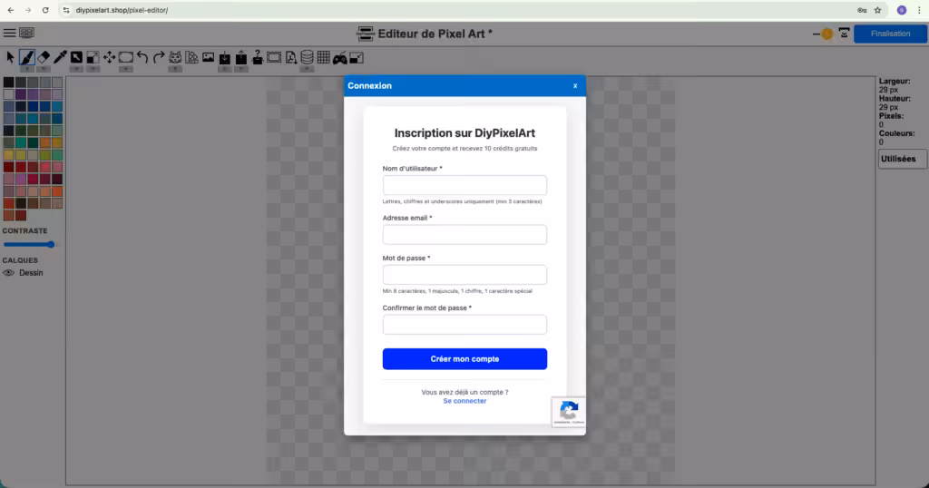 Fenêtre d’inscription sur le site diypixelart.shop
